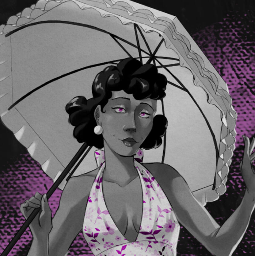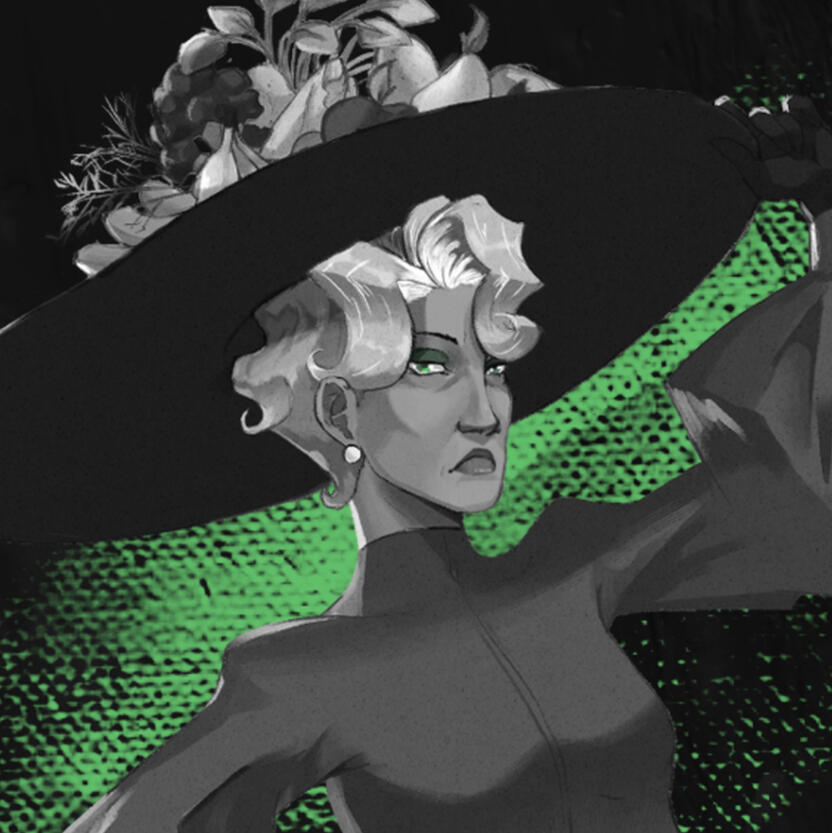 Although Persephone doesn't make a gigantic appearance in this version of the myth. She is certainly an important character. She is a character that haunts the narrative. For her design, I decided to go for a more bright and puffy outfit that young women of the time wore, differentiating her from the other, darker and more corporate character designs. I wanted Persephone's design to instead take inspiration from more mainstream outfits of young adult women in the 50s.